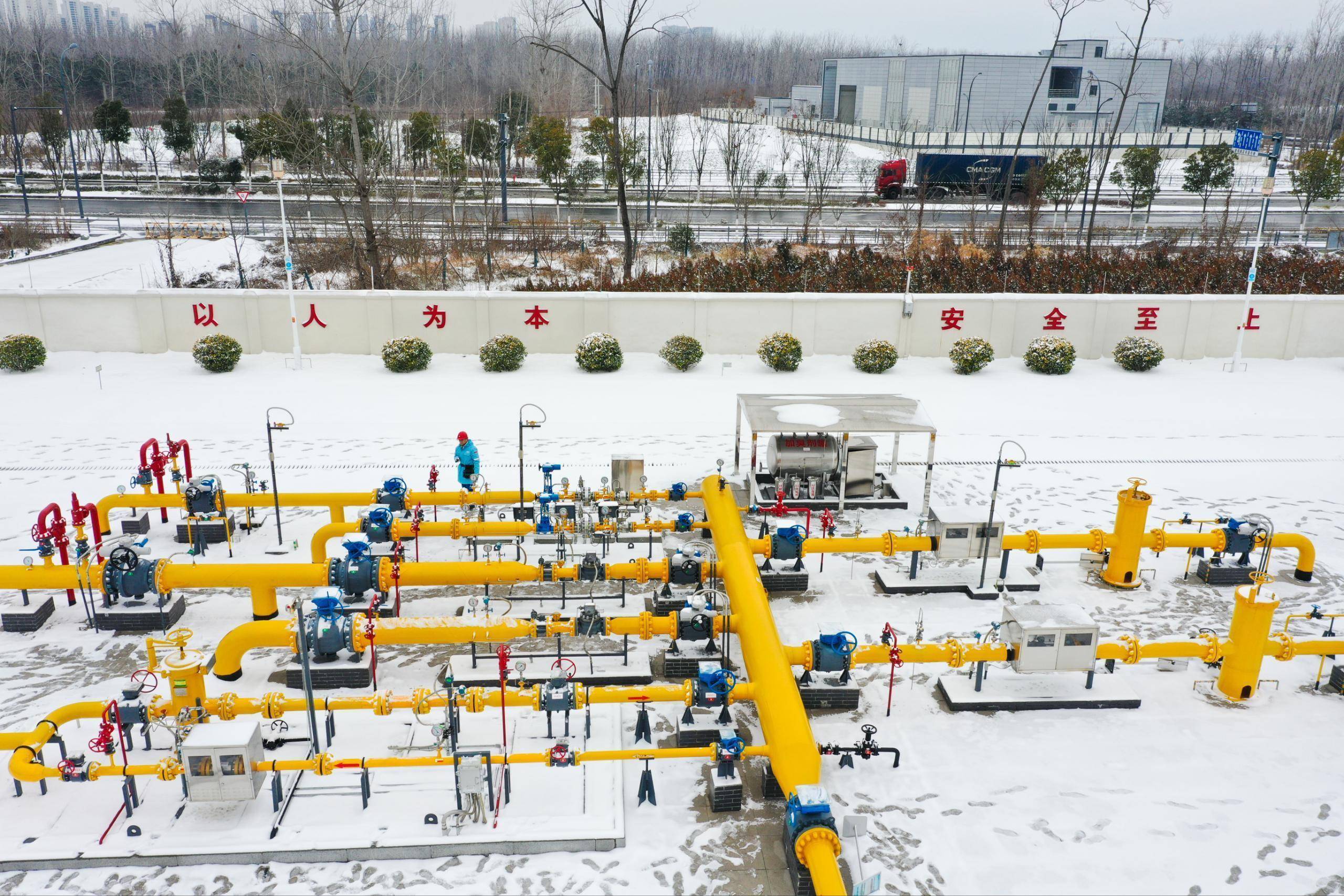 在昆仑合燃公司加气站,工作人员一遍遍清扫场站积雪,并铺设防滑设备,为加气车辆提供快速、安全的加气服务,保障城市交通能源补给不断档。