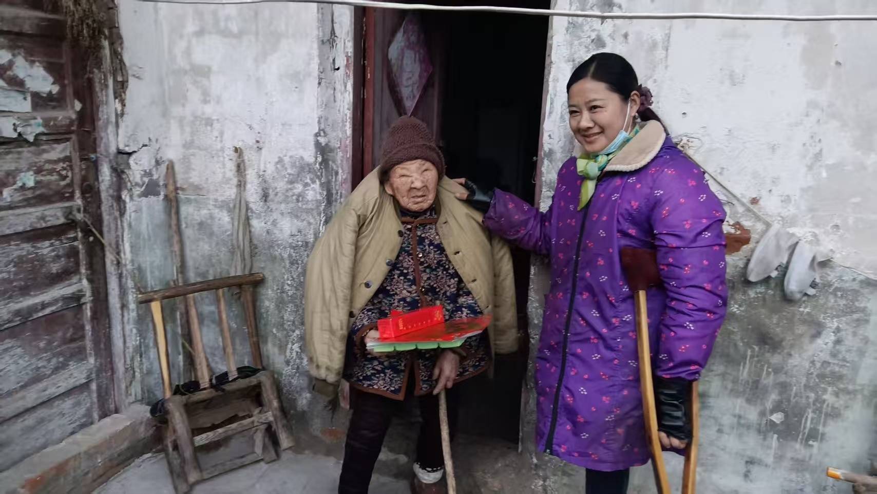 方丹(右一)小年给老人们送饺子和春联 (受访者供图)