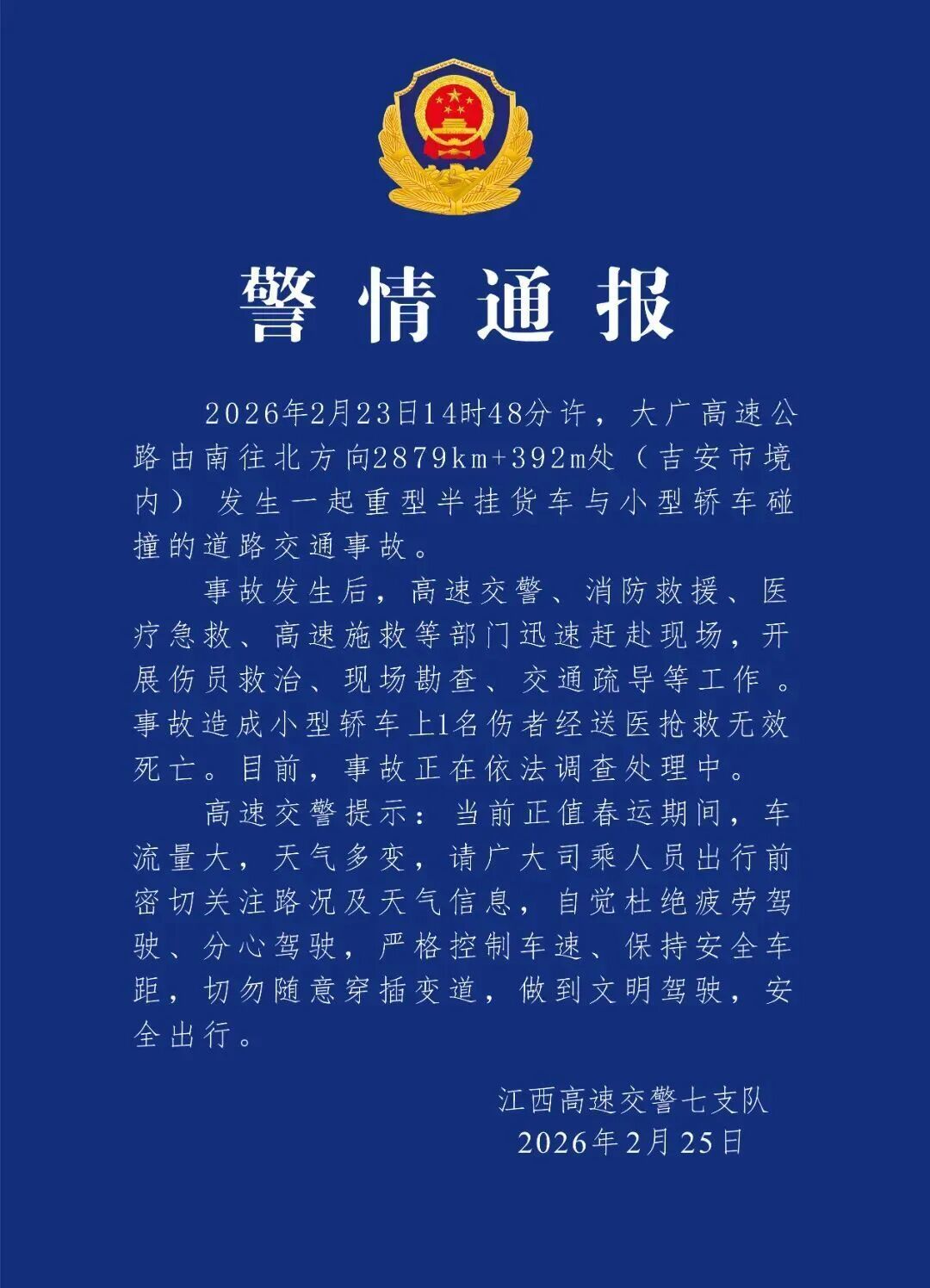 2月25日,江西高速交警七支队发布“警情通报”称: