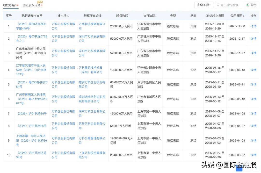 另外,万科企业还存在14起股权冻结事项,均发生在2025年,对应股权数额合共约27.58亿元,案件集中在广东省、湖南省、辽宁省、江苏省以及上海市。