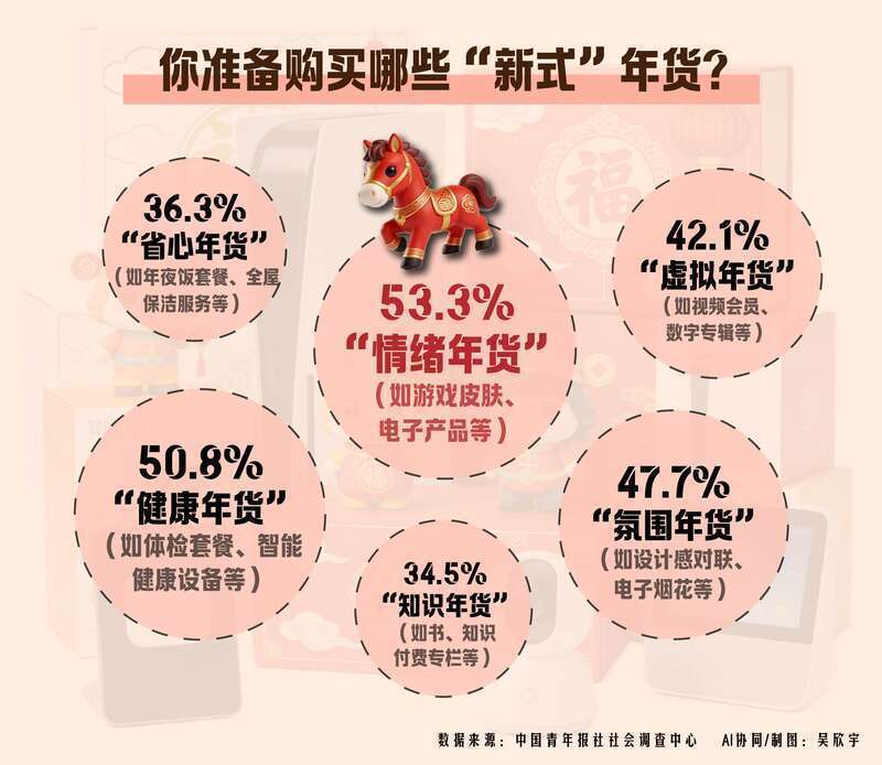 春节临近,社交媒体上掀起一股“新式”年货分享潮。除了传统的食材、礼品礼盒,各种“电子年货”、潮玩好物开始出现在年轻人的年货清单上。近日,中国青年报社社会调查中心联合问卷网(wenjuan.com)进行的一项有1335名受访者参与的调查显示,超九成(95.4%)受访者准备购买“新式”年货。为自己买的“情绪年货”(53.3%)、送给家人的“健康年货”(50.8%)是更受青睐的“新式”年货。