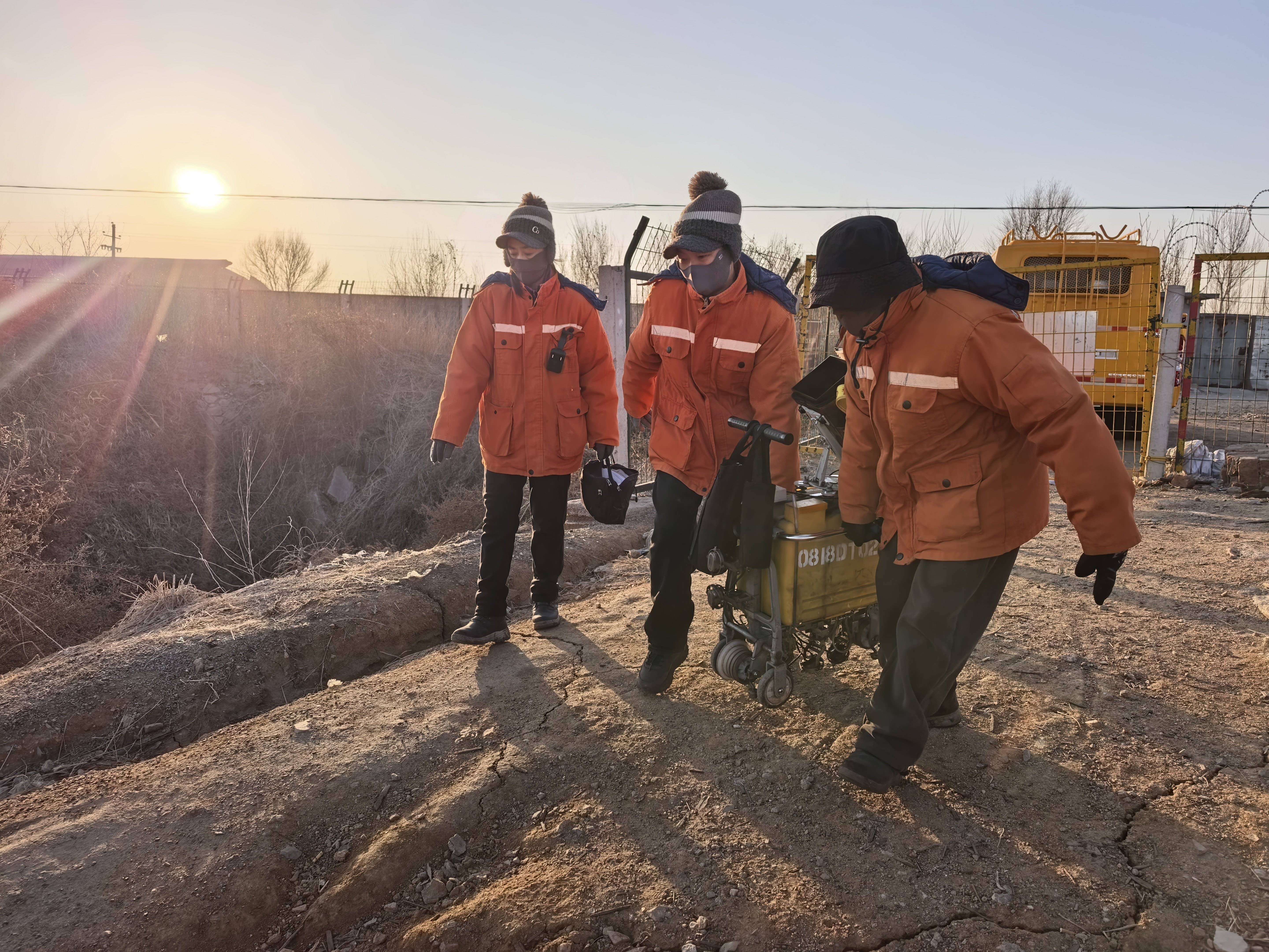 戴上口罩、帽子,队员们把自己裹得严严实实。早晨七点半,队员们合力将重达50余公斤的探伤仪抬上作业车,向着柳村南一场驶去。户外的风迎面扑来,脸被刮得生疼,手指难展,可班长霍智慧却说:“最近天气回暖,今天这天气算好的了。”