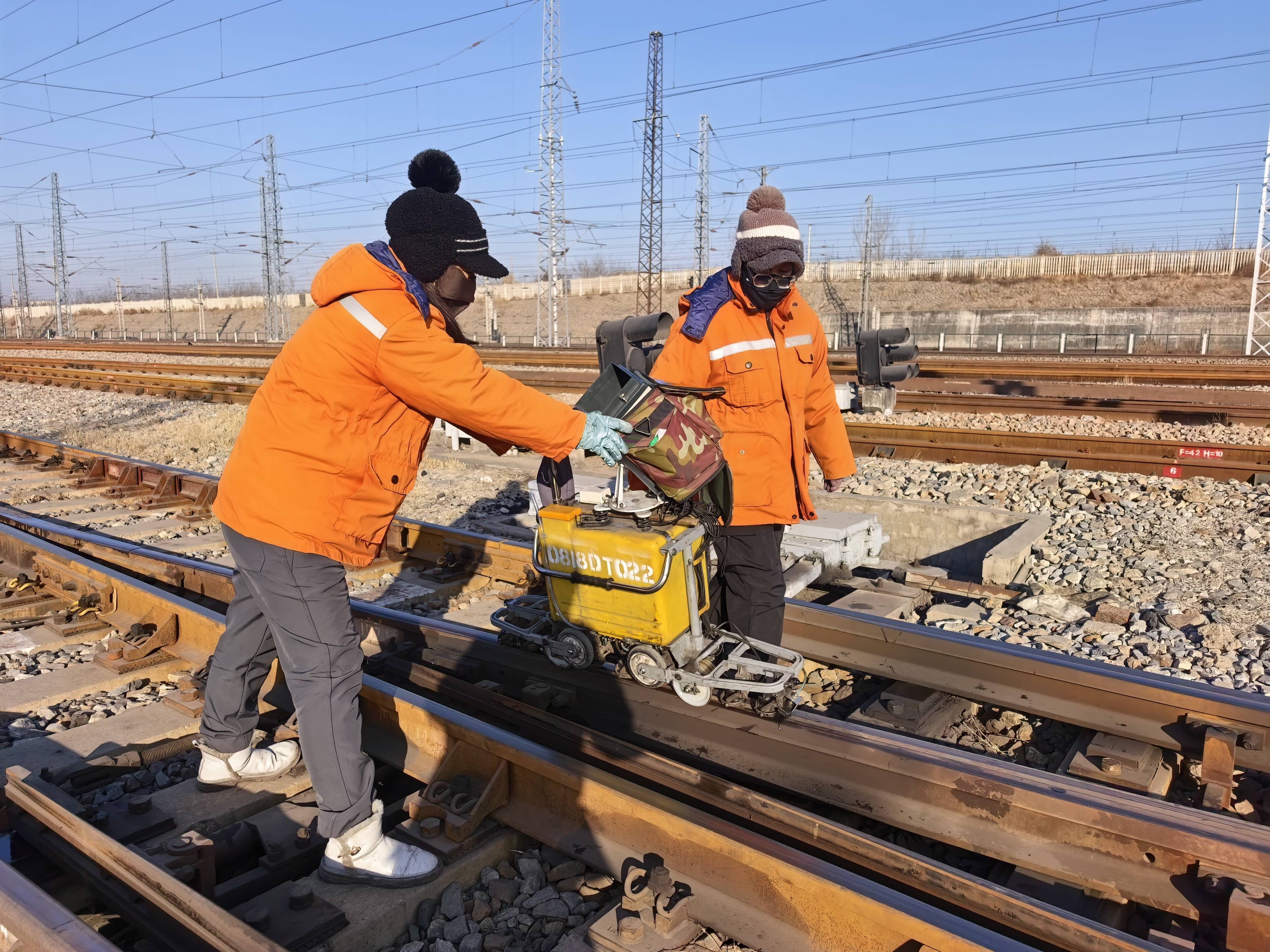 队员们抵达作业地点,抬着探伤仪走向铁轨。新华社记者 郭雅茹 摄柳村女子探伤工区于2007年成立,是中国铁路太原局集团有限公司工务系统的一支女工探伤队伍。作为大秦铁路这条“中国重载第一路”上的特殊力量,11人的班组肩负着大秦线柳村、港站及秦东三个大型编组站181公里线路、403组道岔的钢轨探伤检测任务。春运期间,大秦线车流密集,钢轨的安全保障,是这群探伤工肩上沉甸甸的责任。