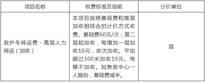 收费标准及说明:本项目按照基础费和楼层加收相结合的计价方式收费。基础费60元/次;第二层起加收,每增加一层加收10元,依次加收。平抬超过100米加收10元。电梯不加收。如急救中心一人搬抬,基础费减半。