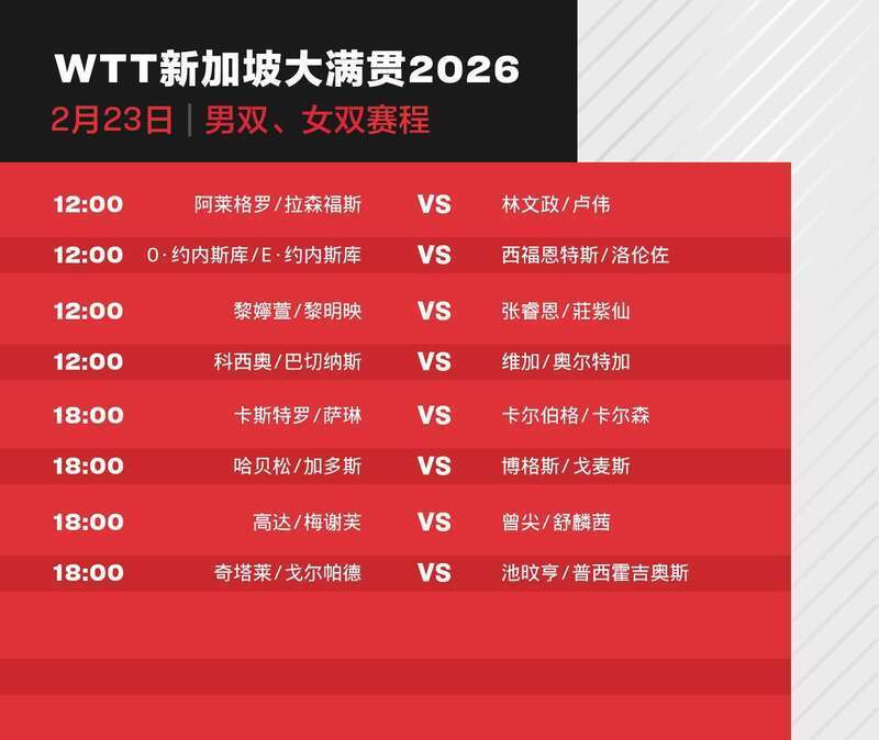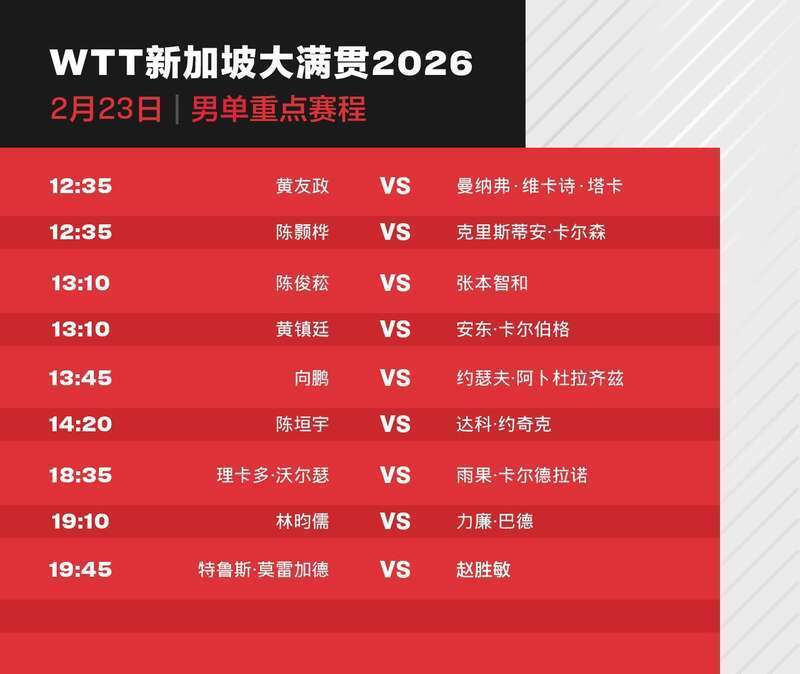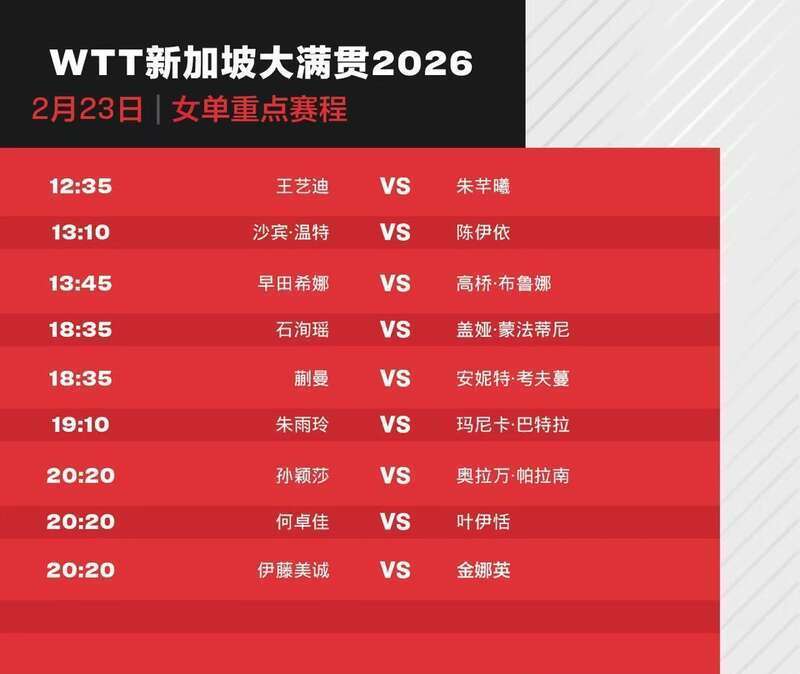 今天(23日),2026年WTT新加坡大满贯进入正赛第二天,孙颖莎、蒯曼、王艺迪、向鹏和陈垣宇等出场。具体赛程如下: