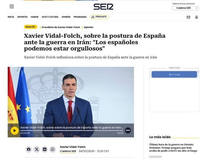 △当地媒体对西班牙反战立场的评论,标题为:西班牙对伊朗战争的立场:“西班牙人可以为此感到自豪。”